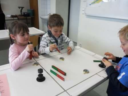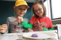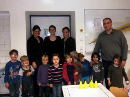 Die „Schulgeister“, wie sich die Gruppe aus 20 Schulanfängern selbst nennt, führten unter Anleitung von Frau Jost und Frau Otto Versuche im Bereich Physik und Chemie durch.