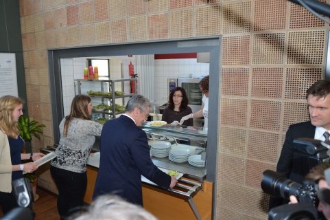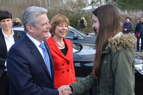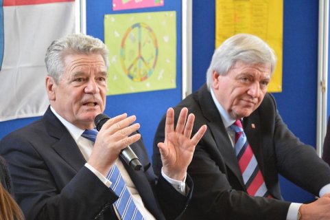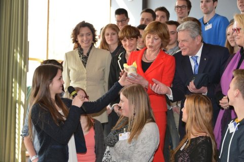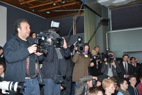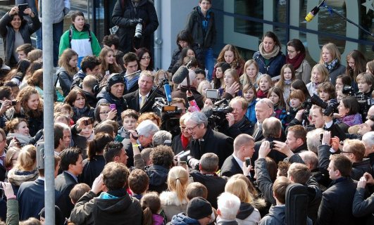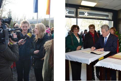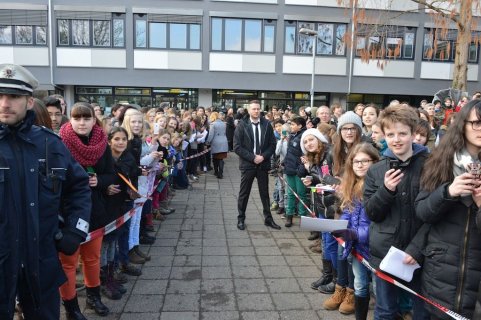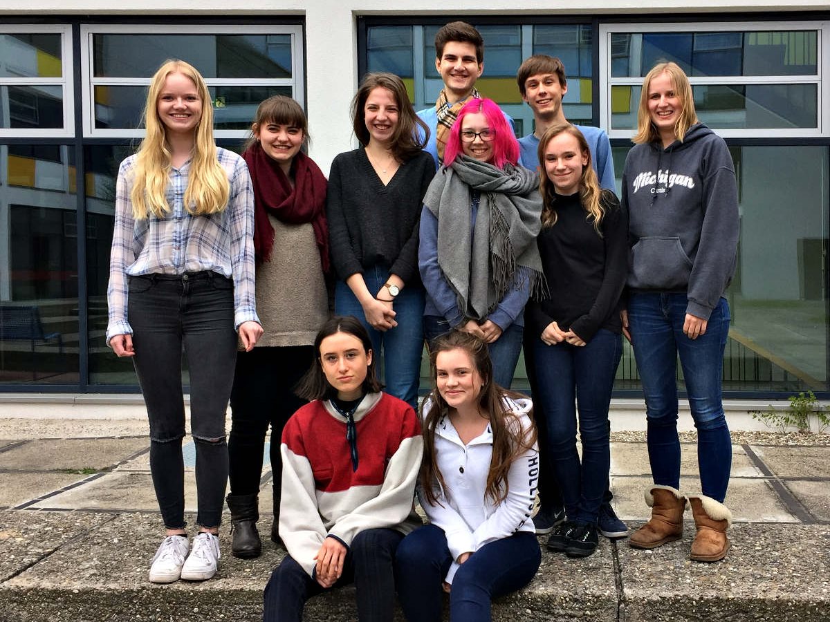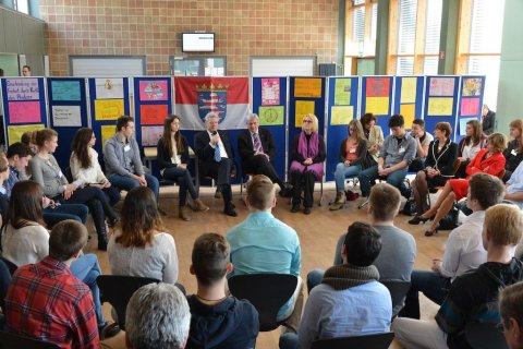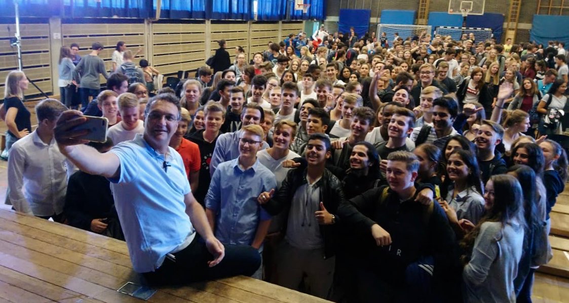 Er schreibt aber nicht nur historische Romane für Kinder, Jugendliche und Erwachsene, sondern auch den hier vorgestelltenMitratekrimis „Das Geheimnis der Amphore“. So einen Mitratekrimi kann man aber nicht nur lesen, sondern auch in ihm aktiv mitmachen, Rätsel und Fragen selbst lösen. Dieses erfahren auch die Schüler/innen heute und so knobeln sie in der Schulaula gebannt, wie denn wohl die Geheimschrift „Cäsars Quadrat“ — die es übrigens historisch gegeben haben soll — zu entschlüsseln sei. Franjo Terhart plaudert aus dem Nähkästchen und verrät, dass er bei diesen Mitratekrimis zunächst die Rätsel erstelle und erst dann die eigentliche Handlung schreibe. Das römische Alltagsleben, ohne Polizei, aber mit einer Schule, mit angesehenen Berufen wie z.B. Imker, aber auch Senatoren etc. und bestimmten Alltagsgewohnheiten im Alten Rom wird im Mitratekrimi anschaulich, ansprechend und humorvoll dargestellt.