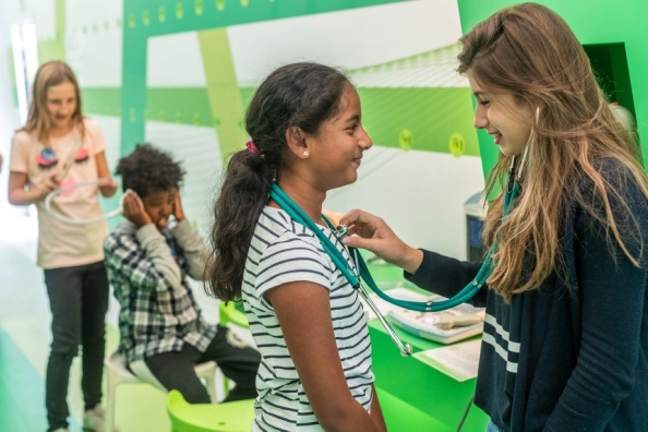 Den Herzschlag hören: Shaili (links) und Lena von der Lichtenberg-Schule aus Darmstadt führen ein Experiment durch. Im Hintergrund untersuchen Kidus (rechts) und Alisa Schallwellen die Fähigkeit des räumlichen Hörens.