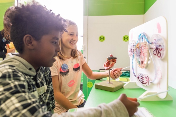 MINT Club Kids aus Klasse 6 vermessen ihren Körper im Humboldtmobil in Darmstadt