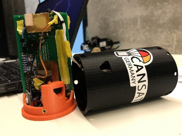 Der LuO-Cansat mit seiner 3D-gedruckten Hülle und seinem komplizierten Innenleben. Oben in gold erkennt man den CO2-Sensor und rechts unter dem Cansat-Logo befindet sich die motorgesteuerte Klappe, mit der die Pflanzensamen ausgeworfen werden.