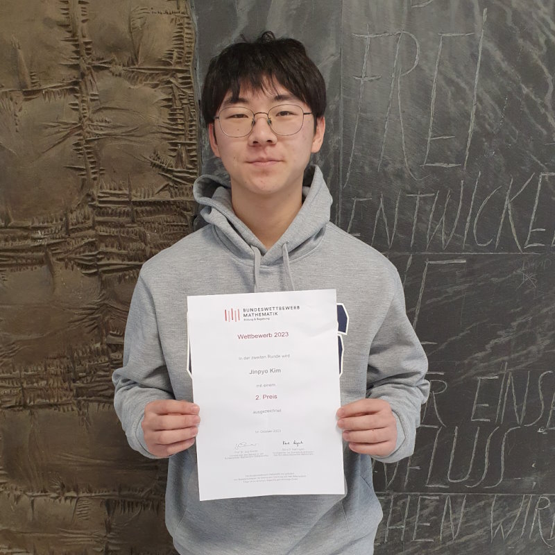 Jinpyo Kim (Q3) wurde in der zweiten Runde des Bundeswettbewerbs Mathematik 2023 mit einem 2. Preis ausgezeichnet. Zu dieser herausragenden Leistung gratulieren wir herzlich!