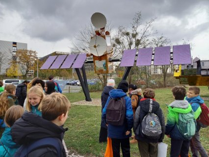 Wir hatten einen tollen Tag und haben viel über Erdbeobachtungs- und Wettersatelliten gelernt. Satelliten können auch Menschenleben retten, weil sie Rettungssignale empfangen und weiterleiten können. Und wir haben gelernt, dass es einen Weltraumfriedhof gibt, in dem der Weltraumschrott herumfliegt. Irgendwann in der Zukunft soll es einen Satelliten geben, der mit einem Netz Weltraumschrott einfängt und diesen an der Erdatmosphäre verglühen lässt.