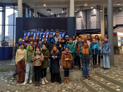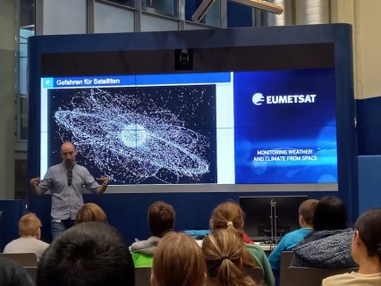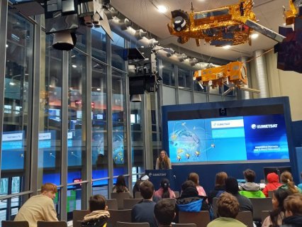 Am 21.11. waren wir zu EUMETSAT eingeladen. Uns wurden die Aufgaben von Satelliten und von EUMETSAT erklärt. Dabei haben wir festgestellt, dass ESA-Satelliten für die Erforschung anderer Planeten da sind und dass die Satelliten der EUMETSAT für unseren Planet „Erde“ zuständig sind. Außerdem haben uns Frau Vázquez und Herr Ordás erklärt, dass LEO-Satelliten näher an der Erde sind als GEO-Satelliten und sie deswegen alles auf der Erde „sehen“. GEO-Satelliten sind viel weiter entfernt und „sehen“ immer nur den gleichen Punkt auf der Erde, da sie sich mit der Erde drehen. Wir durften sogar in das Kontrollzentrum reinschauen und uns draußen lebensgroße Modelle von Satelliten angucken.