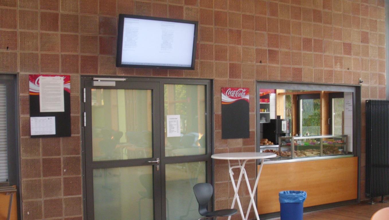 Durch Gelder des Fördervereins konnte nun auch in der Mensa ein Monitor zur Anzeige der Änderungen im Stundenplan installiert werden. Dieser Monitor soll "Staus" vor den schon im Betrieb befindlichen Monitoren in der Schule verhindern. So können sich die Schüler, während sie am Kiosk und der Essensausgabe anstehen, über die aktuellen Änderungen informieren.