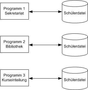 Beispiel An der Schule werden an verschiedenen Stellen Stammdaten der Schüler wie Vorname, Nachname, Geburtsdatum benötigt, z. B. im Sekretariat, in der Bibliothek und beim Studienleiter, der die Kurse einteilt. Alle nutzen unterschiedliche Programme und verwalten dabei ihre eigene Schülerdatei.