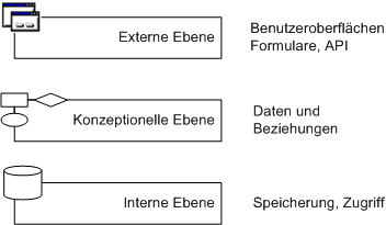 Das Datenbankmanagementsystem bildet nun eine einheitliche Schnittstelle zwischen den Benutzern und Daten. Aus ihm resultiert eine Drei-Ebenen-Architektur, bei der auf jeder Ebene spezifische Aspekte des Datenbanksystems beschrieben und realisiert werden.