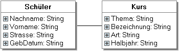 Schüler(Schülernummer, Nachname, Vorname, StraßeNr, PLZOrt, Telefon, GebDatum) Kurs(Kursnummer, Thema, Art, Halbjahr, Jahrgangsstufe)