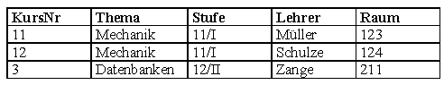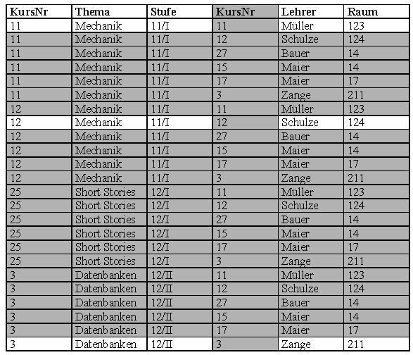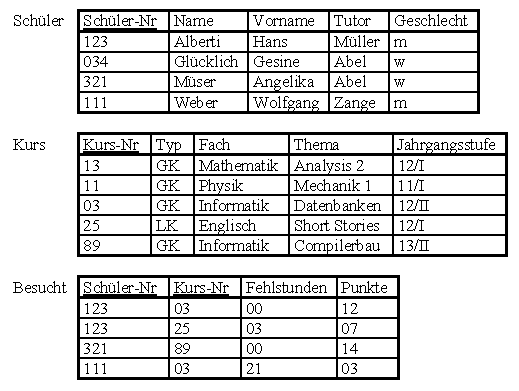 Zur Darstellung eines komplexeren Beispiels gehen wir von folgenden Tabellen einer Oberstufenverwaltung aus: